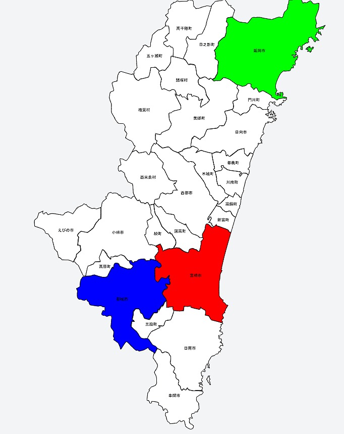 地図上は宮崎市と都城市は隣だが、宮崎駅から都城駅まで普通電車で1時間以上かかるので、同じ都市圏とはいえない。