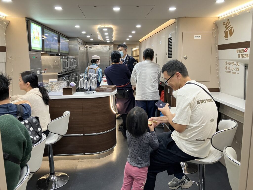 ただの売店でしかない昼間の「復興」号と違い、夜行「復興」号の食堂車には、「サンライズ」のミニサロンに似た感じのカウンター席が設けられている。