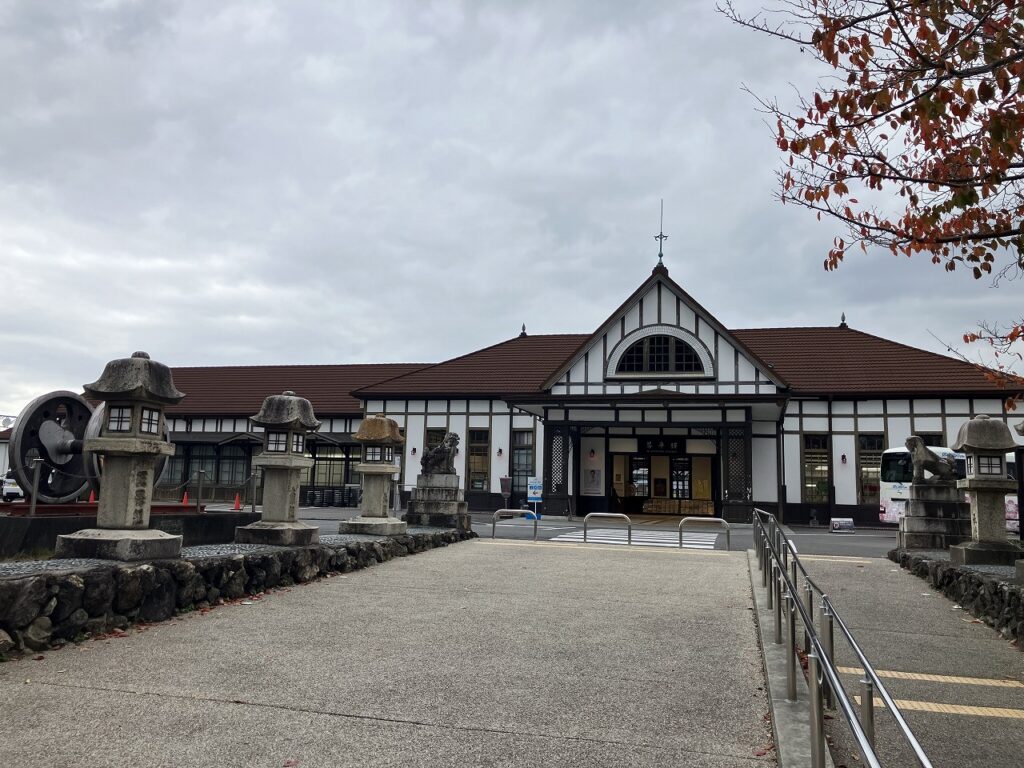 山あいの狭い平野に佇む駅は市街地の規模に反して驚くほど広く、ホームの向こうにも留置線や職員用宿舎がある。