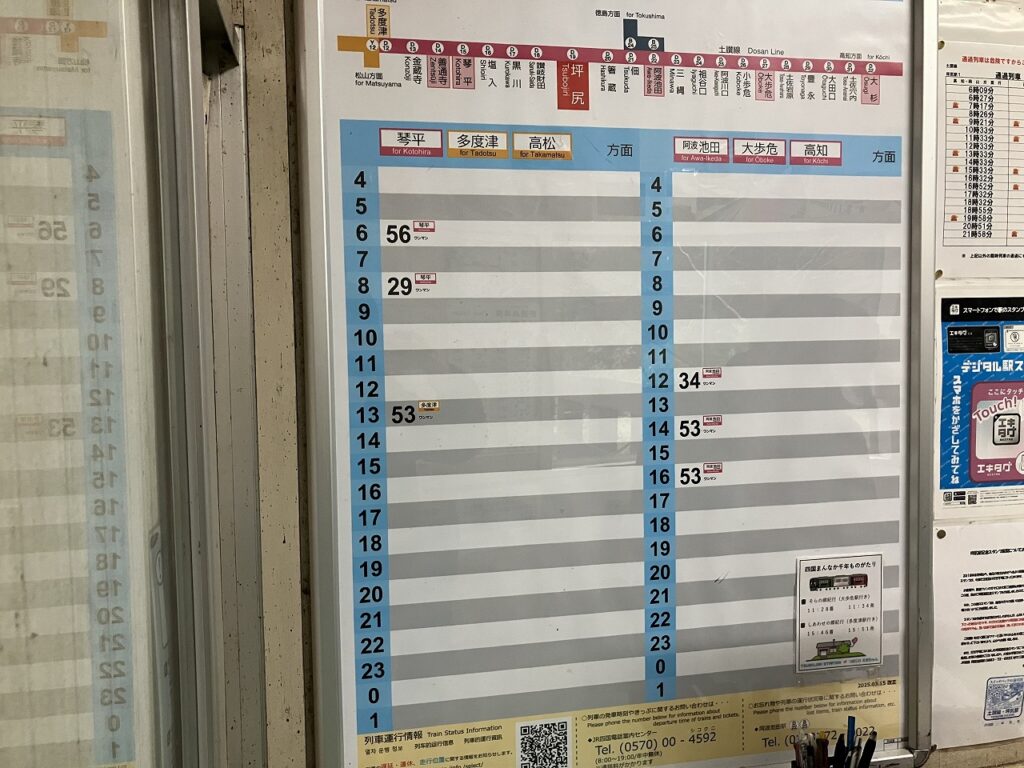 琴平から高知まで乗り通せるチャンス(ダイヤグラムでのスジ)は、1日のうちたったの2回(逆方向も同様)のみである。