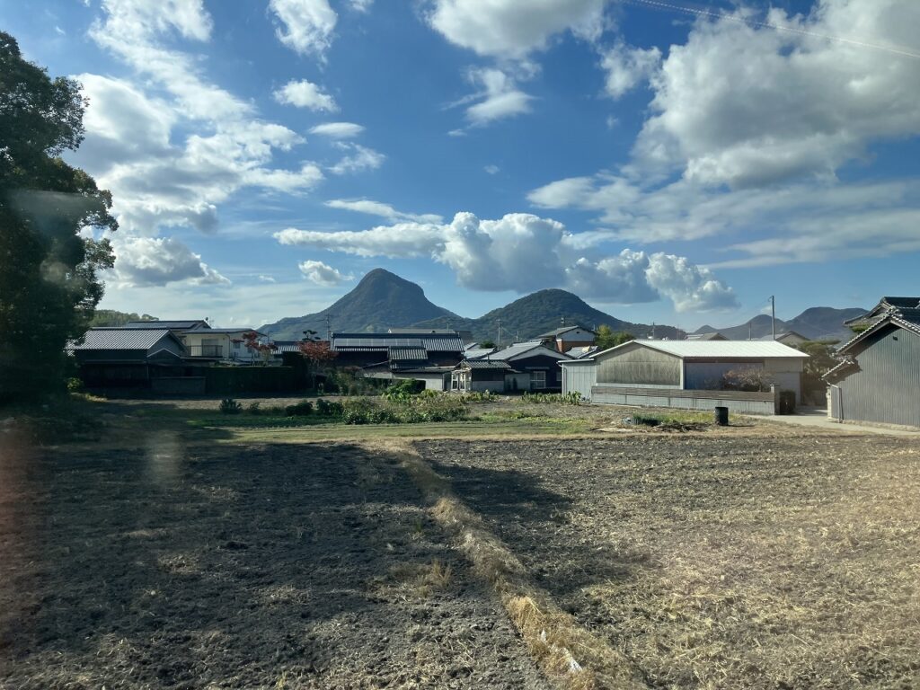 讃岐平野に独特の円錐型の山が点在する。