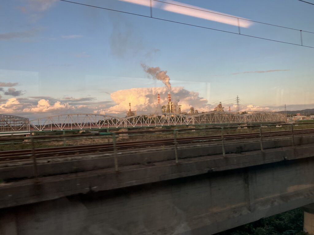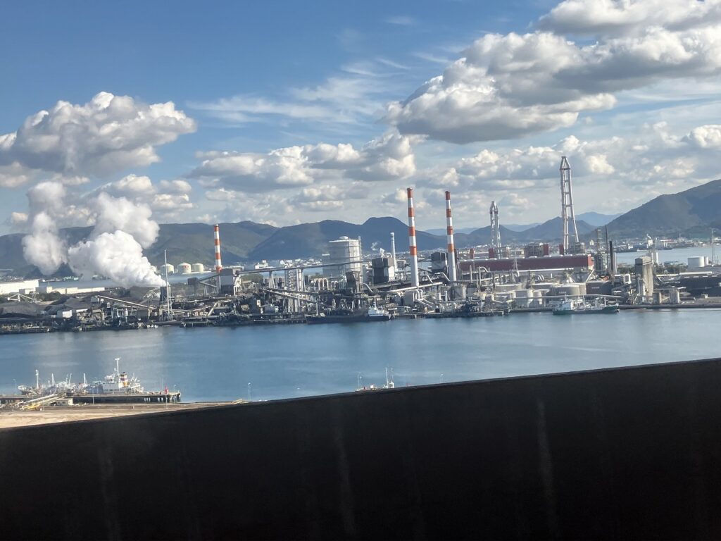 橋の袂で四国を出る乗客を見送ってくれるのは、大規模な臨海工業地帯だ。