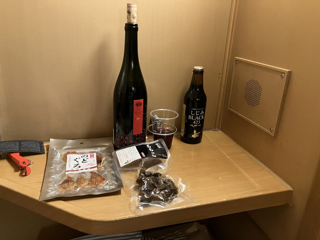 南から北への国土横断の帰り路、長い夜を共にするのは出雲市駅で購入した奥出雲葡萄園の赤ワイン、そしてつまみは高知のカツオと島根のノドグロだ。