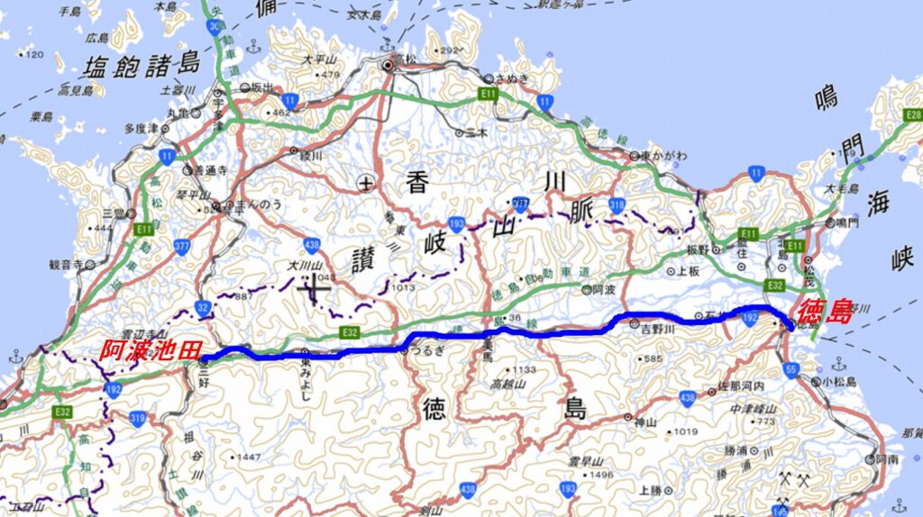 なお列車名の由来である剣山は、四国山地に位置する西日本で2番目に高い山(標高1955m)であるが、車窓からはそれとはっきり見えない。